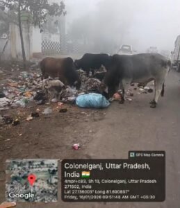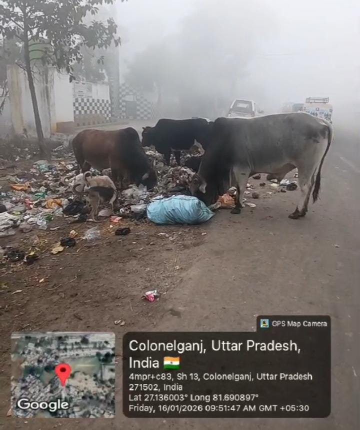 बेसहारा गौवंश कूड़े में मुंह मारते दिखाई दे रहे हैं,जिससे सड़क दुर्घटनाओं और पशुओं की मौत की आशंका भी बढ़ गई है। धुंध और गंदगी के बीच सड़क किनारे खड़े पशु न सिर्फ यातायात के लिए खतरा हैं, बल्कि यह दृश्य स्वच्छता अभियान और गौ-संरक्षण के दावों की पोल खुल रही है।
