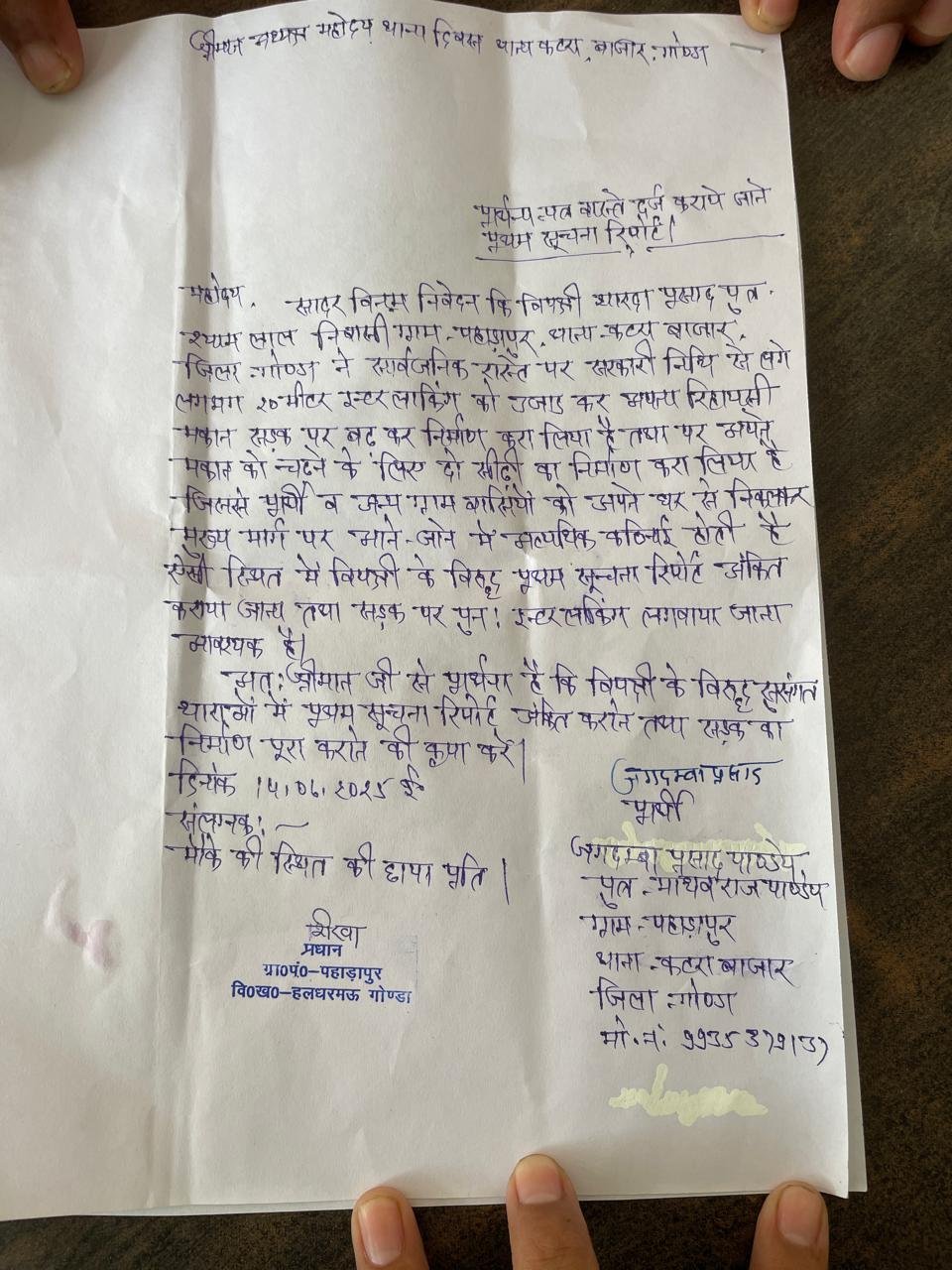 ऐसी स्थिति में विपक्षी के विरुद्ध प्रथम सूचना रिपोर्ट अंकित कराने तथा सड़क पर पुन: इन्टरलाकिंग लगवाये जाने की मांग की गई थी। मामले में जांच अधिकारी/ग्राम विकास अधिकारी व सचिव ग्राम पंचायत विवेकानंद ने 24 जून 2025 को मौके की जांच करके सहायक विकास अधिकारी के माध्यम से जिला पंचायत राज अधिकारी गोंडा को यह रिपोर्ट भेजी थी कि आनलाइन शिकायत सन्दर्भ सं० 40018325018393 के क्रम में शिकायतकर्ता जगदम्बा प्रसाद पुत्र माधवराज निवासी ग्राम पंचायत पहाड़ापुर के द्वारा शिकायत किया गया है कि उनके गाँव के पड़ोसी शारदा प्रसाद शुक्ल पुत्र श्यामलाल शुक्ल ने सार्वजनिक रास्ते पर सरकारी निधि से लगे इण्टरलाकिंग को उखाड़कर अपना रिहायशी मकान सड़क पर बढ़कर निर्माण कर लिया है तथा अपने मकान के ऊपर चढ़ने के लिये दो सीढ़ियों का निर्माण करा लिया है जिससे अन्य ग्रामवासियों को अपने घर से निकलकर मुख्य मार्ग पर आने जाने में कठिनाई होती है तथा उखाड़ी गयी इंटरलाकिंग मौके से गायब है। उक्त क्रम में सादर अवगत कराना है कि मौके पर जाकर सत्यापन में शारदा प्रसाद शुक्ल पुत्र श्याम लाल शुक्ल के द्वारा सरकारी निधि से बने इंटरलाकिंग को उजाड़कर स्वयं के घर की सीमा से बढ़कर इंटरलाकिंग के रास्ते पर बढ़कर निर्माण करा लिया गया है।उपरोक्त जांच आख्या अग्रिम कार्यवाही हेतु सादर प्रेषित है।