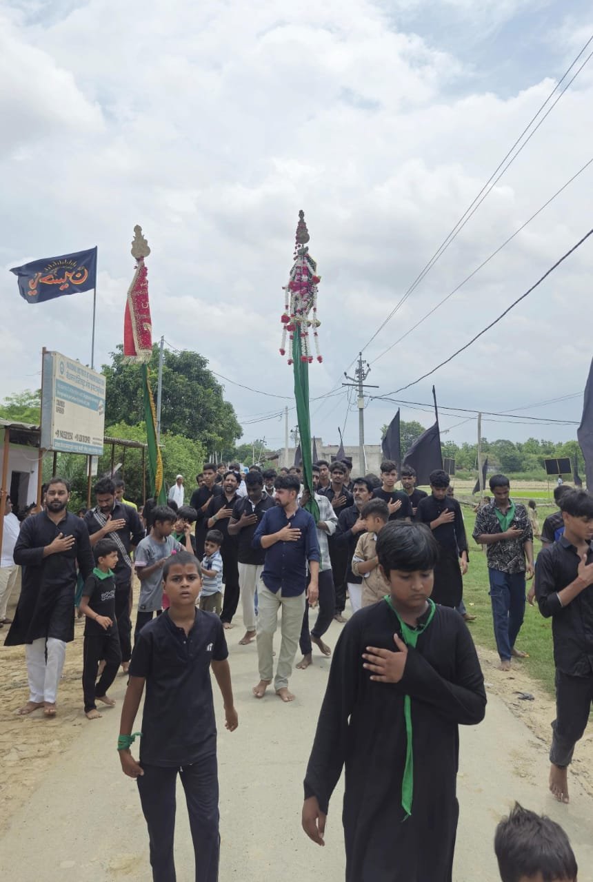सादुल्लानगर,बलरामपुर।क्षेत्र के ग्राम मीरपुर में आठ मोहर्रम के मौके पर हज़रत अब्बास अलैहिस्सलाम के नाम का पारंपरिक जुलूस अकीदत और ग़मगीन माहौल में निकाला गया। जुलूस गांव के मुख्य मार्गों से गुज़रता हुआ दरगाह हज़रत अब्बास (अ.स.) पर जाकर संपन्न हुआ। इस दौरान बड़ी संख्या में अकीदतमंदों की मौजूदगी रही,जिन्होंने ग़म और वफ़ा का इज़हार करते हुए हिस्सा लिया।