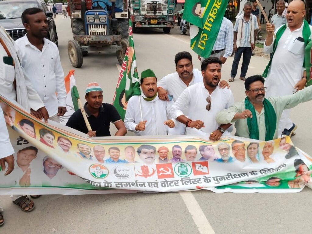 बगहा। बिहार में वोटर लिस्ट पुनरीक्षण के विरोध को लेकर एनएच 727 बेतिया व गोरखपुर मुख्य में महागठबंधन कार्यकर्ताओं एवं नेताओं ने चुनाव आयोग और एनडीए सरकार के खिलाफ जमकर नारेबाजी की। बता दें कि बुधवार को पूरे बिहार में विपक्षी पार्टियों ने बिहार बंद और चक्का जाम का आह्वान किया है।
