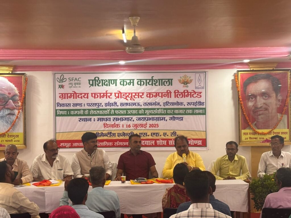 गोण्डा।कृषक हित और ग्रामीण आत्मनिर्भरता को सशक्त बनाने के उद्देश्य से ग्रामोदय फार्मर प्रोड्यूसर कम्पनी लिमिटेड के तत्वावधान में एक दिवसीय प्रशिक्षण कम कार्यशाला का आयोजन माधव सभागार, जयप्रभाग्राम, गोंडा में भव्य रूप से सम्पन्न हुआ। इस कार्यशाला में परसपुर, झंझरी, हलधरमऊ, इटियाथोक, तरबगंज व रूपईडीहा विकास खण्डों से जुड़ी ग्रामोदय फार्मर प्रोड्यूसर कम्पनी लिमिटेड की विभिन्न इकाइयों के किसान सदस्य एवं शेयरहोल्डर 75 की संख्या में उत्साहपूर्वक सहभागी ह