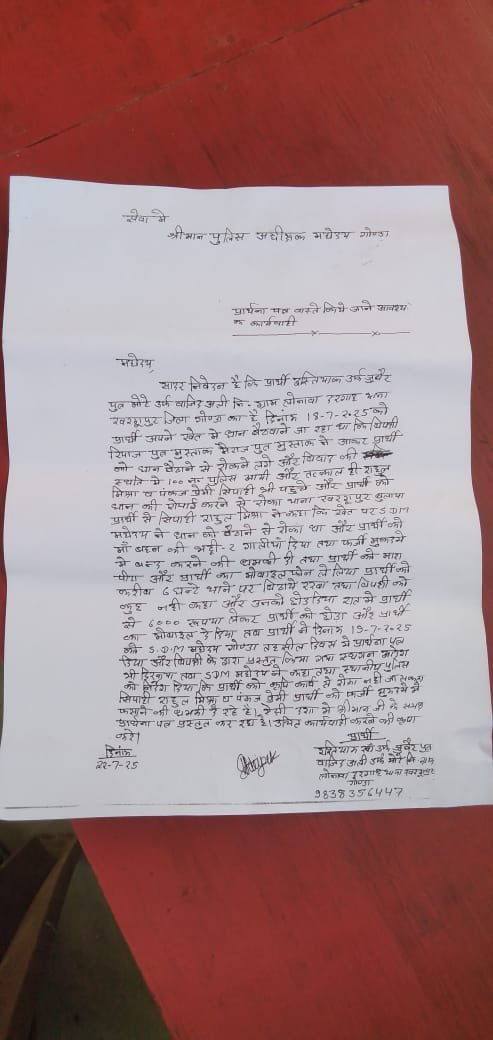 घटना खरगुपुर क्षेत्र के लोनावा दरगाह गांव के निवासी इश्तियाक नाम के व्यक्ति के साथ घटित हुई है। जिसको लेकर पीड़ित व्यक्ति ने मंगलवार को एसपी से मिल कार्यवाही की मांग की है। शिकायती पत्र में पीड़ित ने बताया कि उसका अपने ही भाई पट्टीदार से भूमि को लेकर रंजिश चली आ रही है। जिसको लेकर विपक्षी आए दिन उसे परेशान किया करते है। जिसका मामला न्यायालय में विचाराधीन भी है। उसका कहना है कि वह 18 जुलाई को अपने खेत में धान की रोपाई कर रहा था। तभी विपक्षी उसे धान बैठाने से रोका और डायल 112 को बुलाकर पुलिस की धमकी देते हुए उसे मारा पीटा भी। आरोप है कि पुलिस ने उसकी एक भी न सुन उसे थाने पर ले आई। जहां उसे 6 घंटे तक थाने पर ही बैठाए रखा। आरोप है कि पुलिस ने उससे छोड़ने के नाम पर 6 हजार रुपया भी ले लिया। जिसको लेकर उसने एसपी से विपक्षियों के खिलाफ उचित कार्यवाही करने की मांग की है।